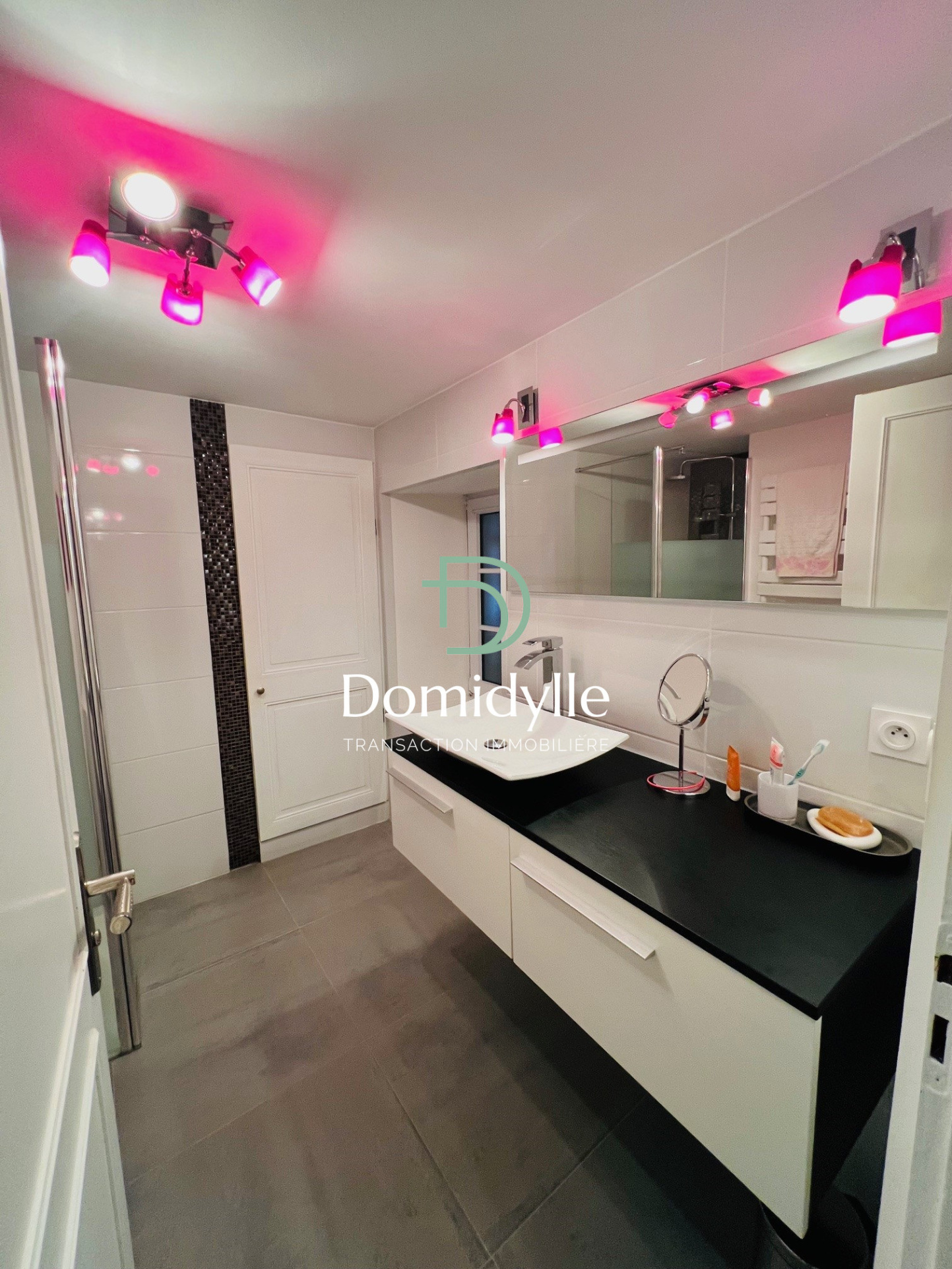 Une salle d’eau avec sèche-serviettes, ainsi qu’un WC suspendu indépendant, complètent le rez-de-chaussée.